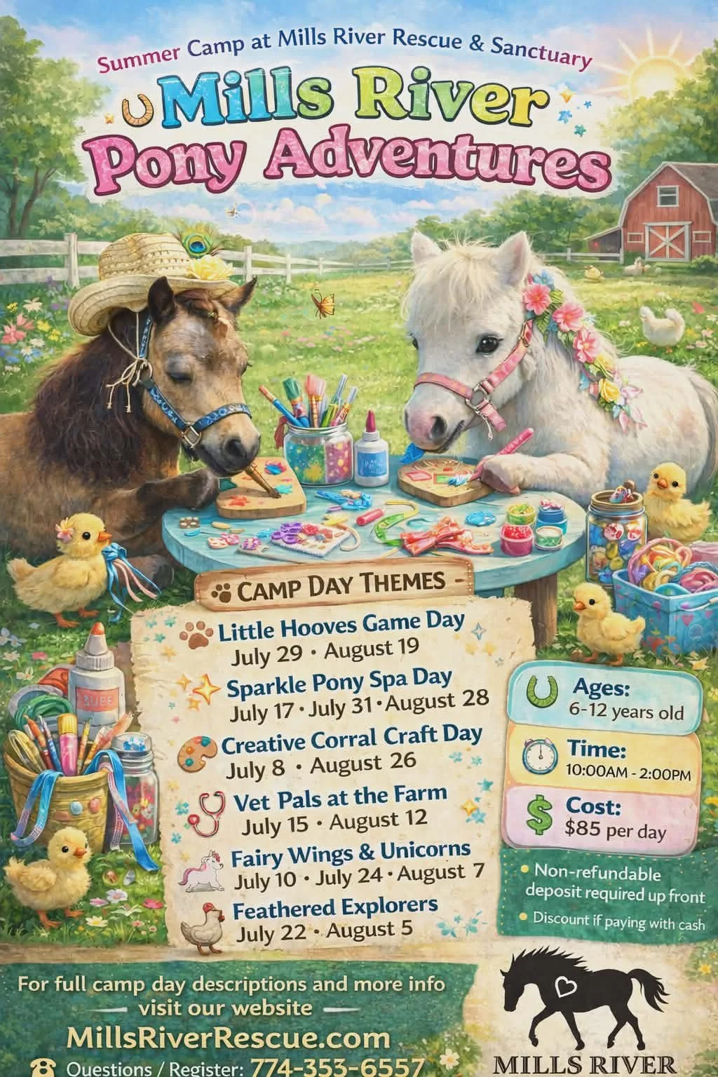 Mills River Rescue and Sanctuary banner held by Volunteeers Deb and Liz at the front of our ponies .